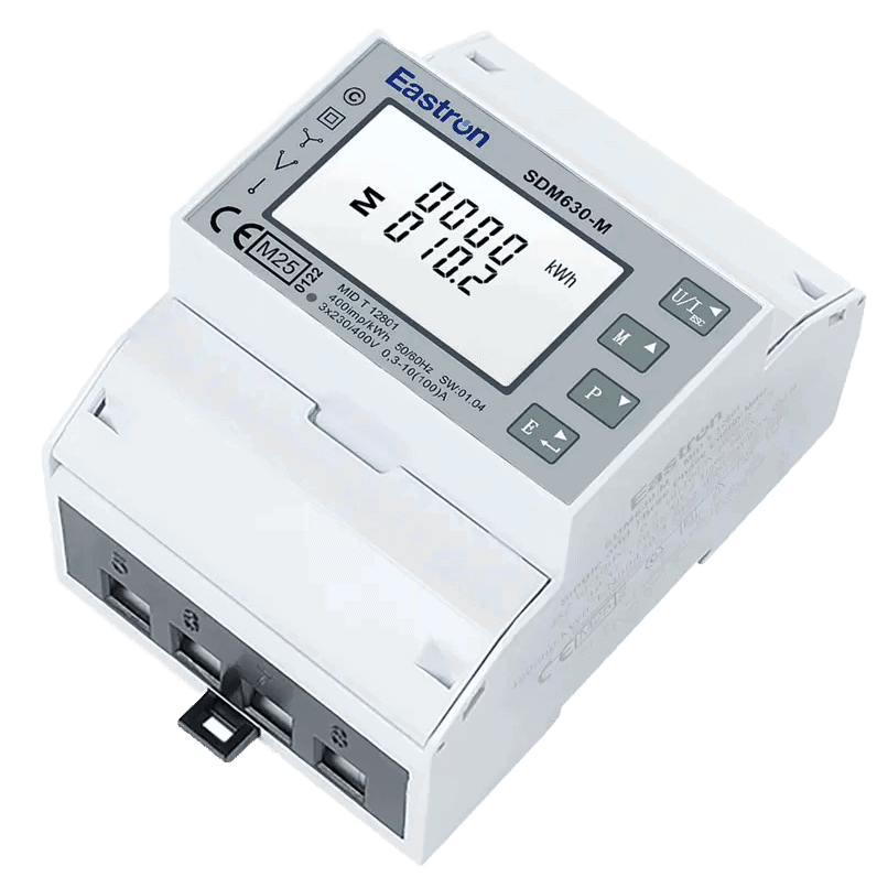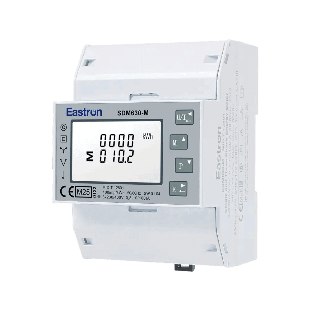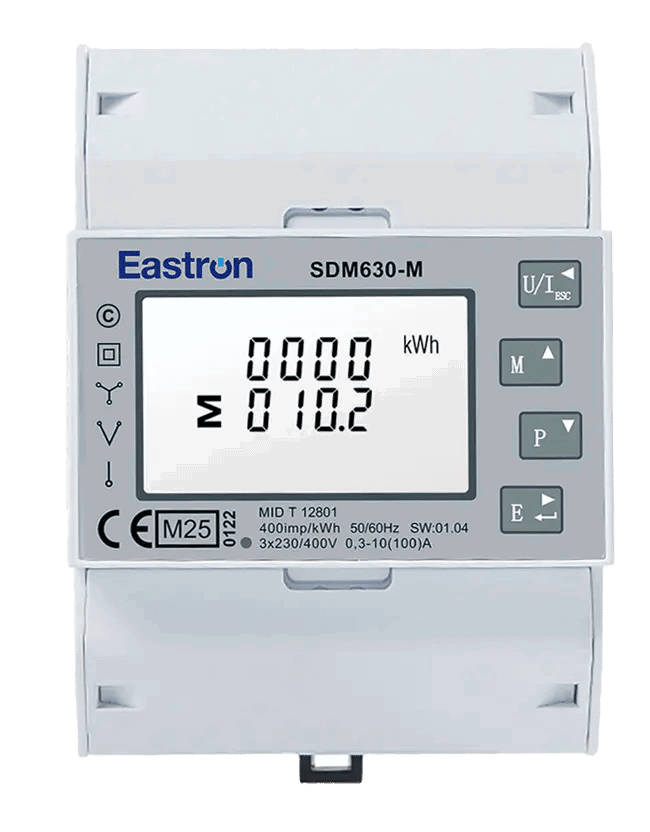 Measure and display the power consumption or yield of three-phase networks. The SDM630-M-MID is ideal for that. This energy meter can be connected directly (100A). The measured values, both import and export, can be read on the backlit LCD screen.